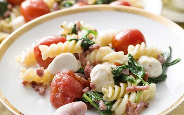 Spirelli met spekjes, mozzarella en kerstomaten